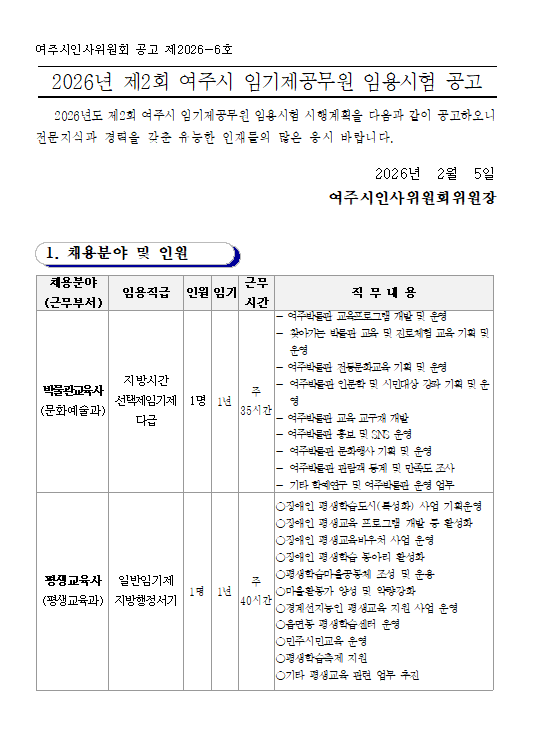 2026년 제2회 여주시 지방임기제공무원 임용시험 공고