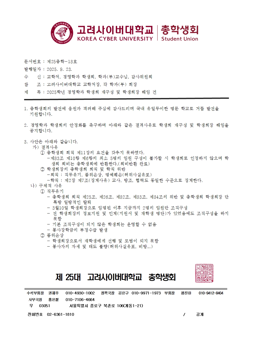경영학과 학생회 재구성 및 학생회장 해임 공지