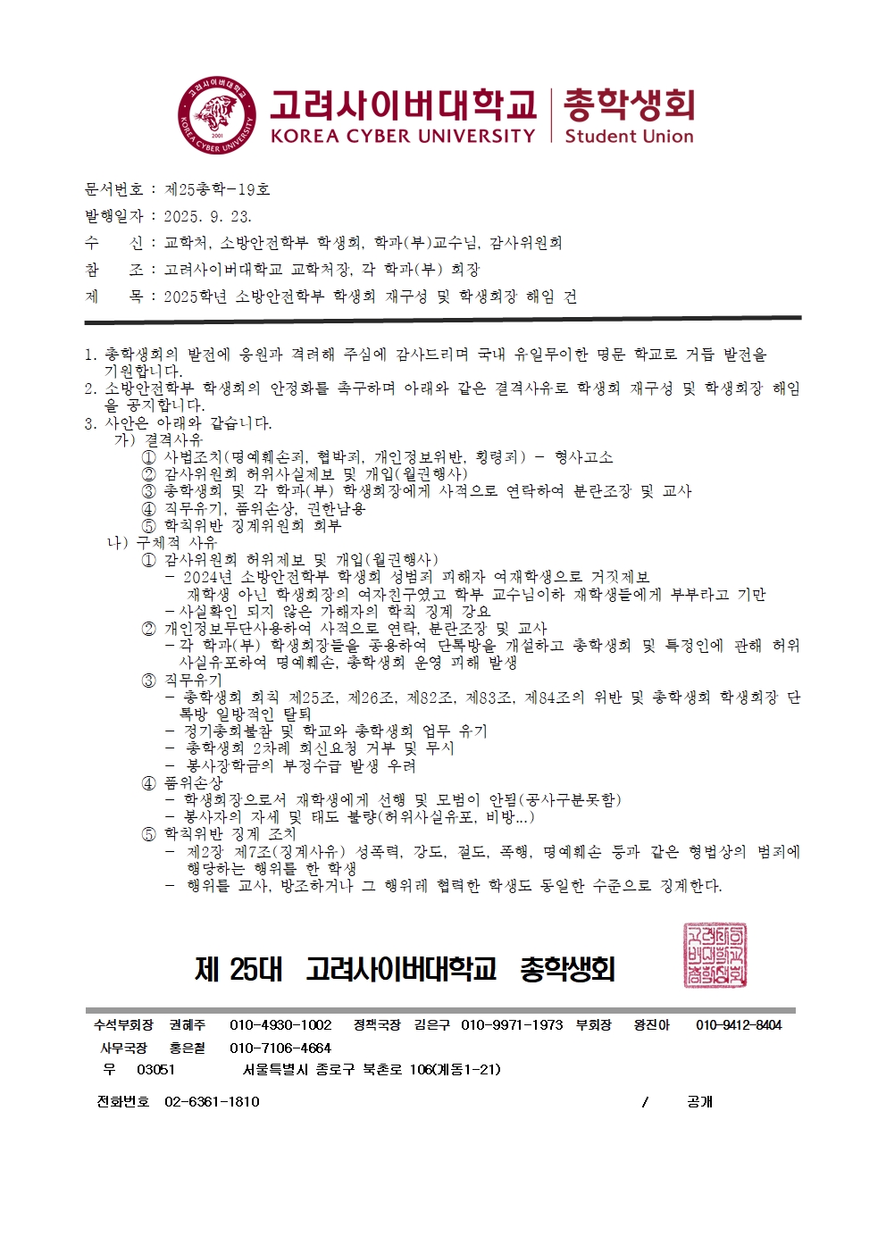 2025학년 소방안전학부 학생회 재구성 및 학생회장 해임 공지