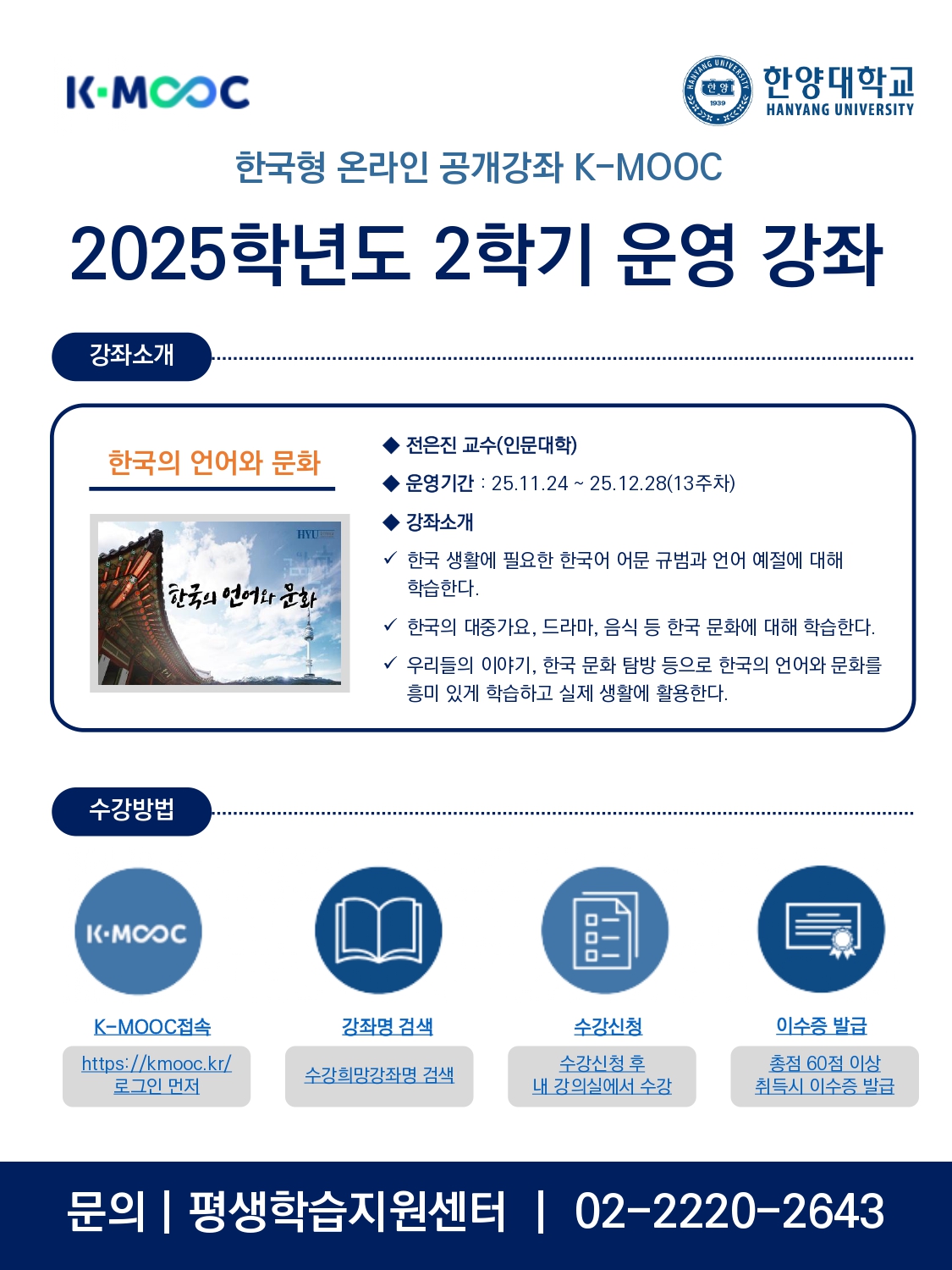 [한양대학교] 2025학년도 하반기 한국형 온라인 공개강좌 (K-MOOC) 강좌 수강안내 및 홍보