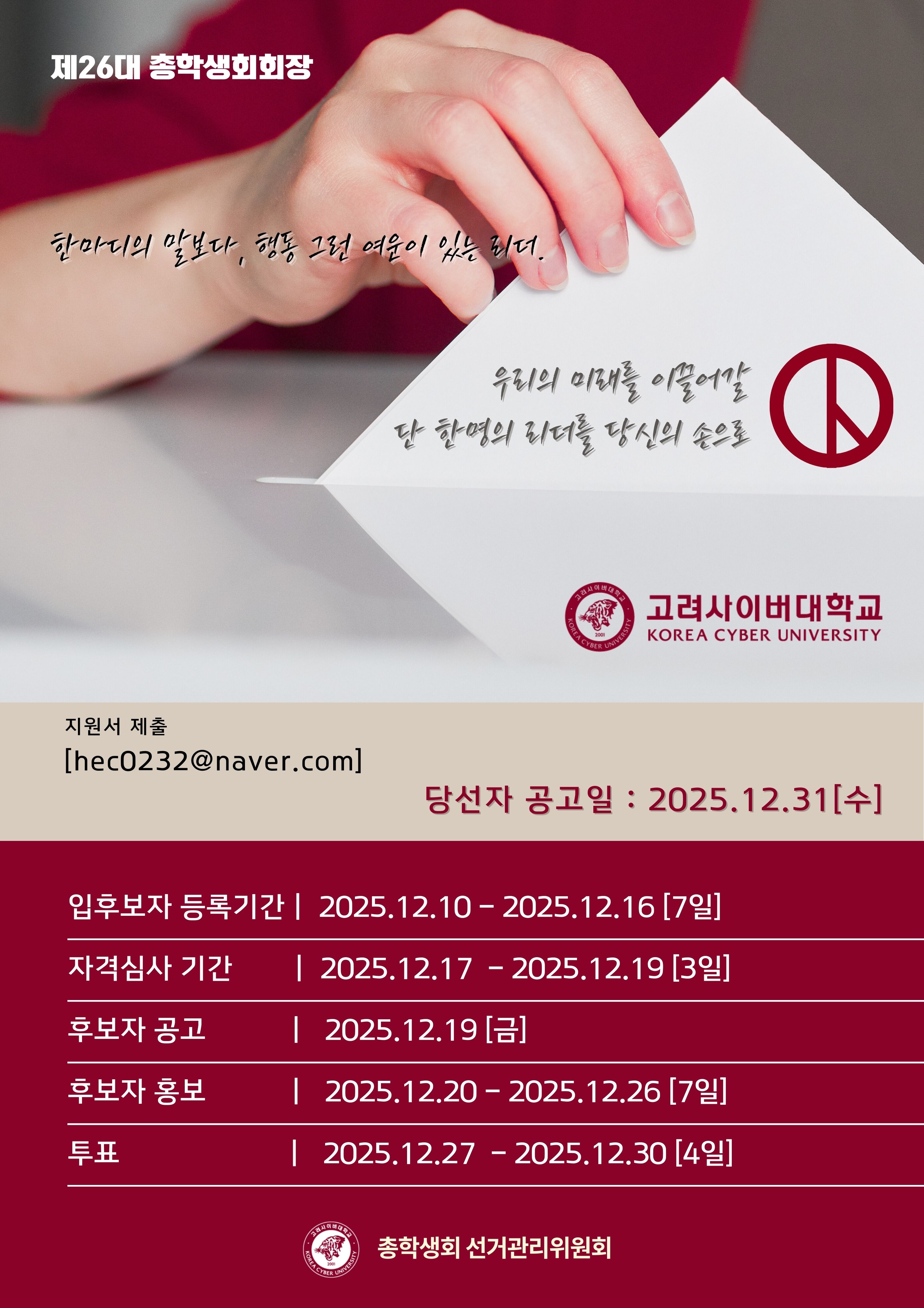 🌟 제26대 총학생회장 예비 후보자님들의 많은 참여를 기다립니다.