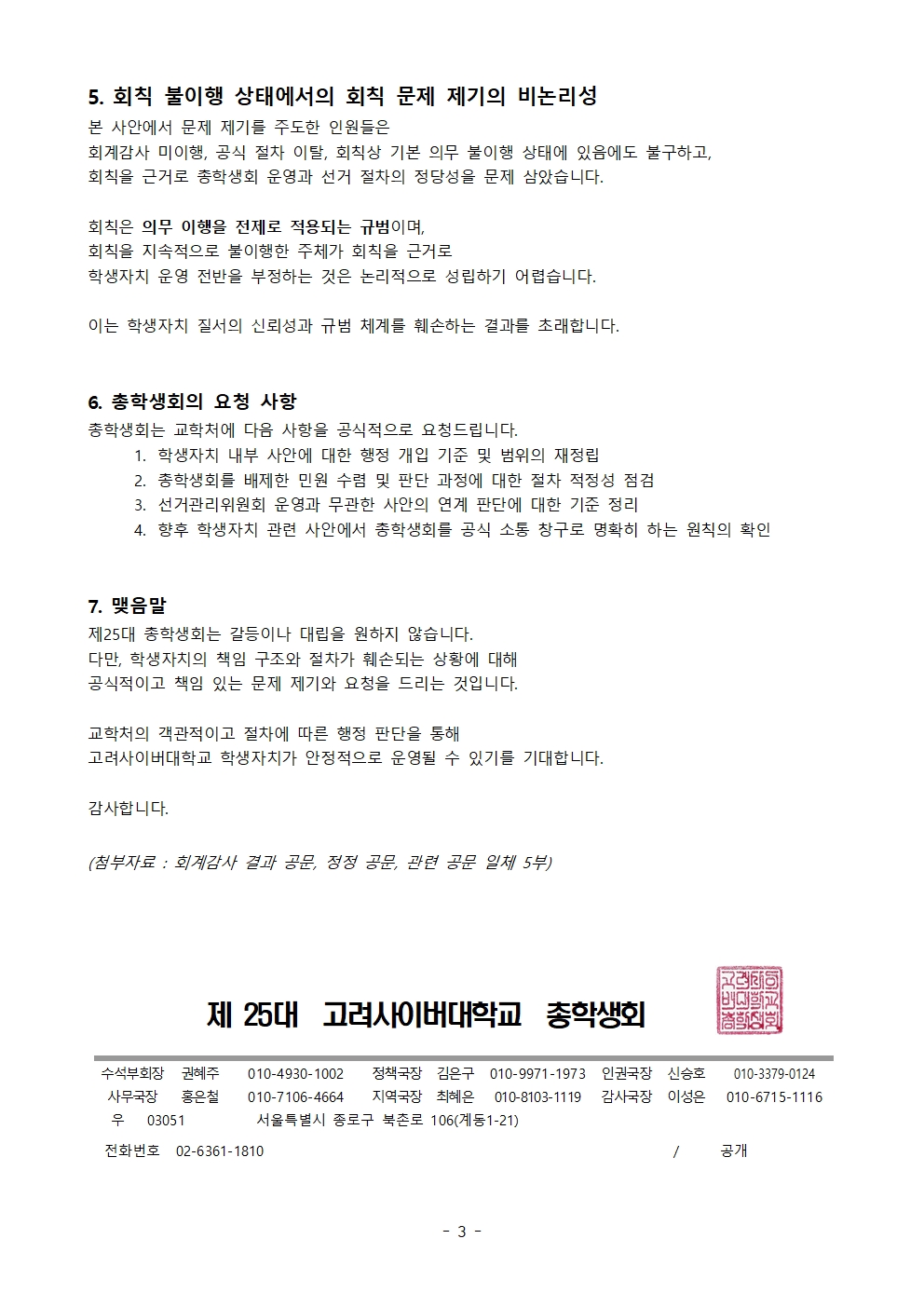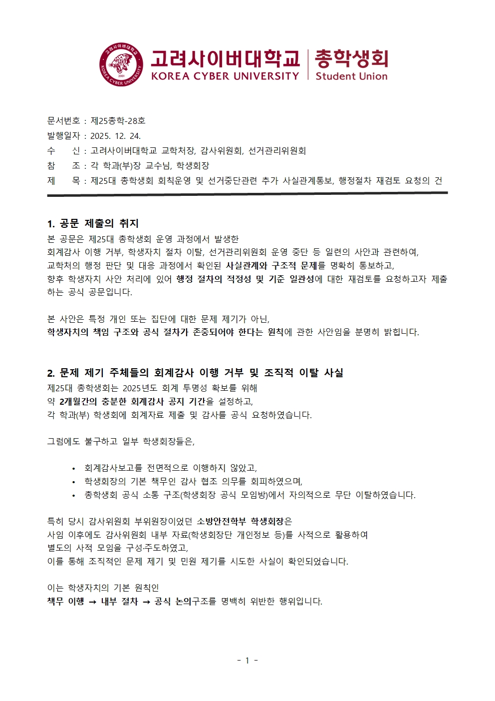 제25대 총학생회 회칙운영 및 선거중단관련 추가 사실관계통보, 행정절차 재검토 요청