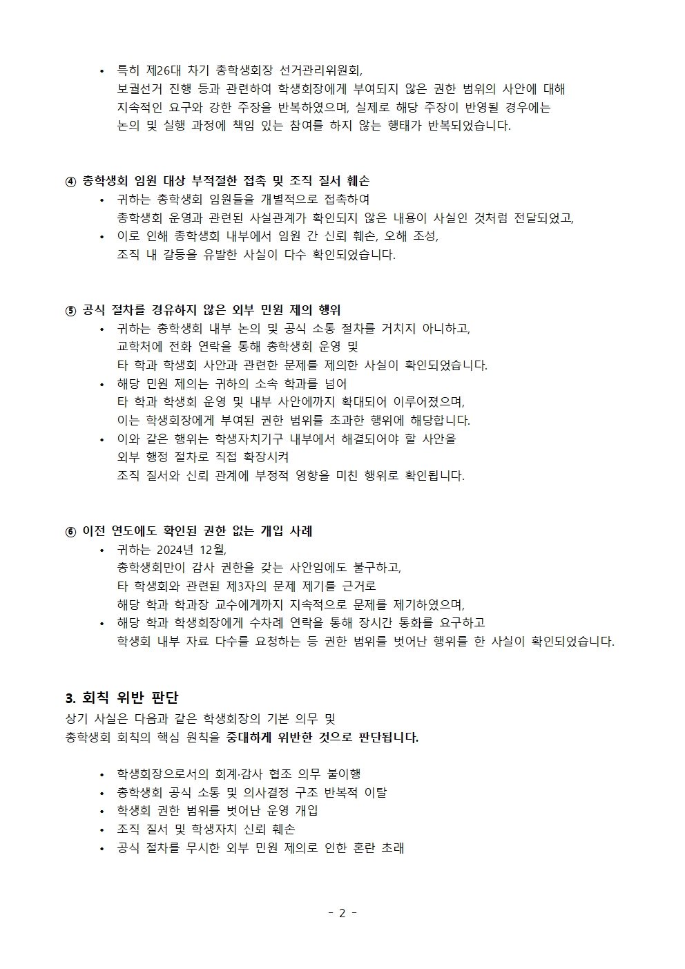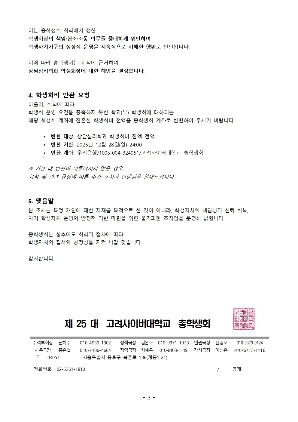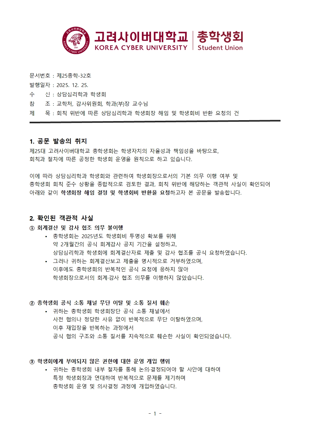 해당 공문에 기재된 해임 결정 및 학생회비 반환 요청 사항은