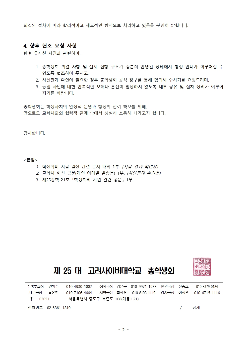 2학기 학생회비 관련 학생회장 동의서 요구에 대한 총학생회 입장 회신