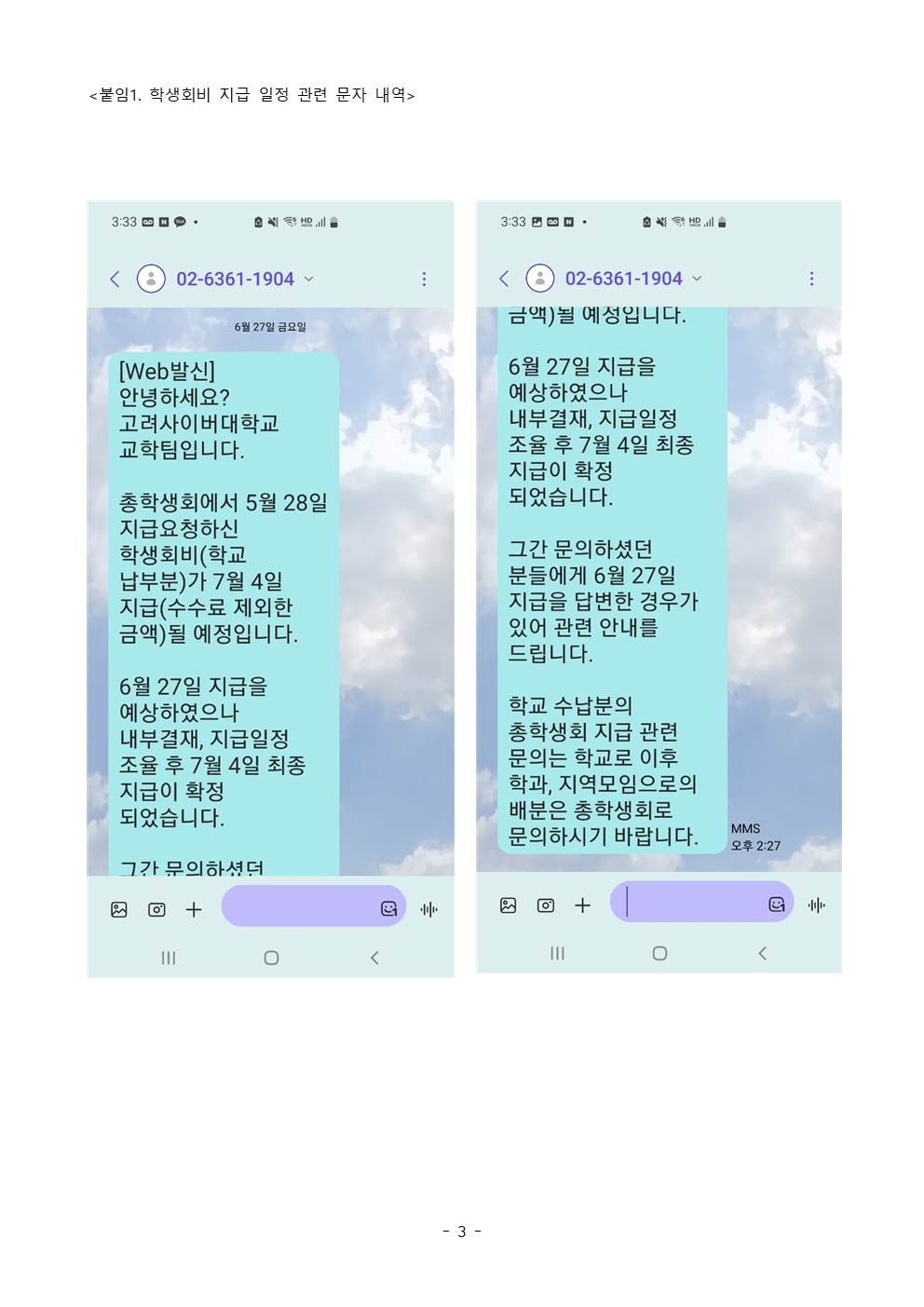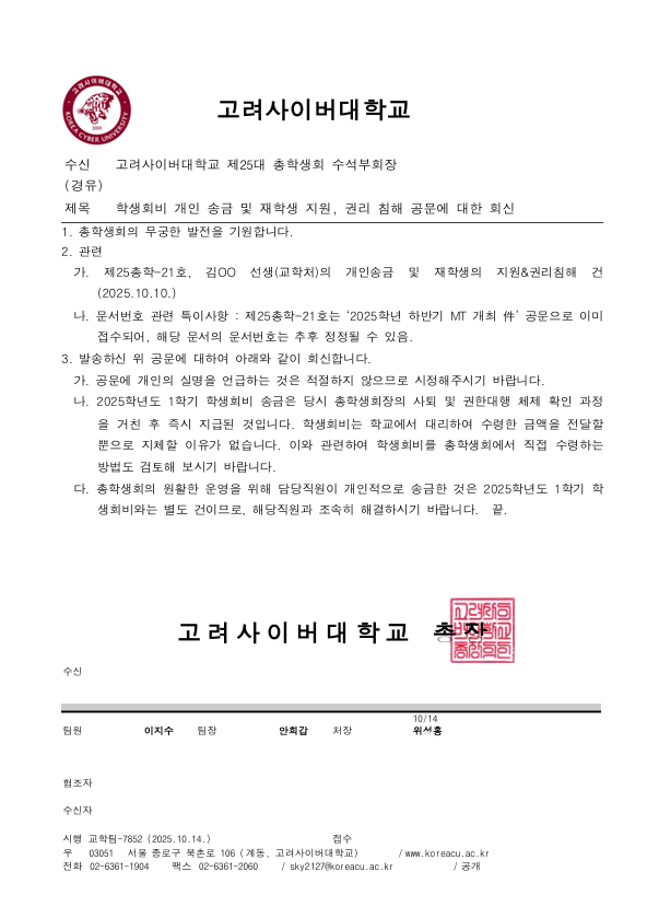 학생회비 개인 송금 관련 회신 및 사실관계 정정의 건