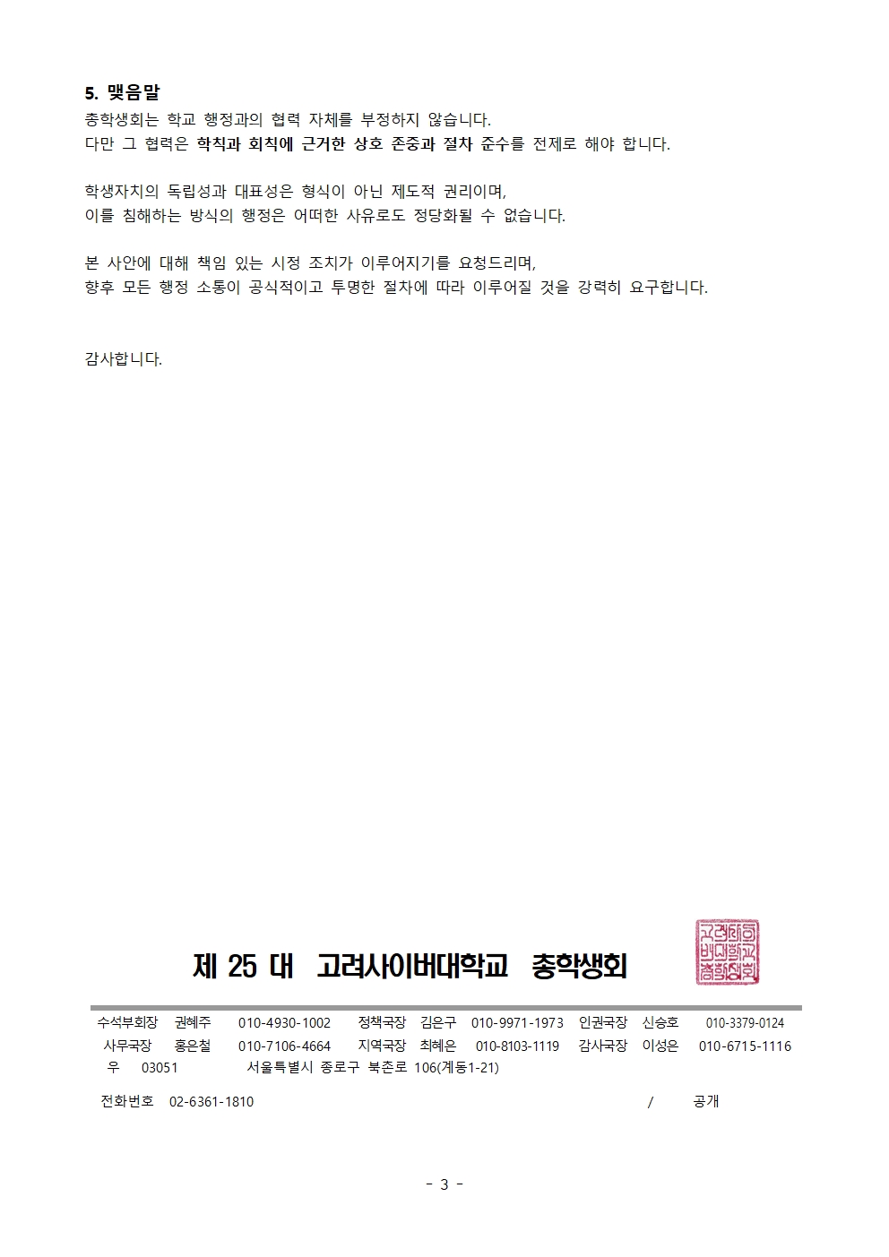 학생자치 관련 행정 절차 위반 행위에 대한 시정 및 재발 방지 요구의 건(학칙 및 회칙 위반)