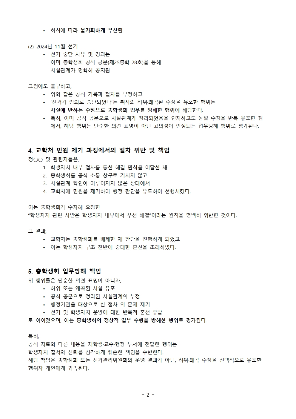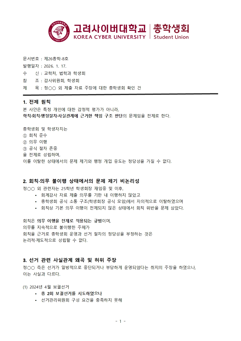 정XX 외 제출 자료 주장에 대한 총학생회 확인 건
